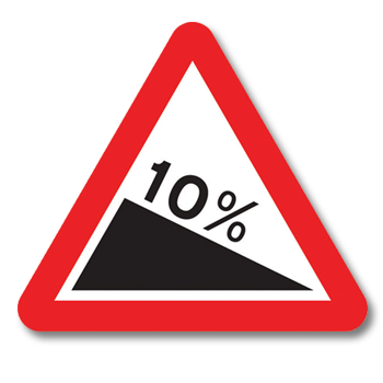This sign gives you an early warning that the road ahead will slope downhill. Prepare to alter your speed and gear. Looking at the sign from left to right will show you whether the road slopes uphill or downhill.